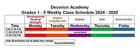 Each school day begins at 9:30 AM. Lunch is from 11:30 AM to 12:30 PM. Each school day ends at 2:30 PM.